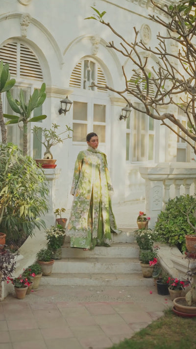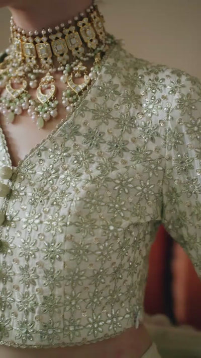 This gorgeous turquoise lehenga choli is a fascinating fusion of classic creativity and everlasting beauty that exudes appealing attractiveness. The choli features a jewel-like neckline, crafted from sheer organza and adorned with intricate patterns brought to life through meticulous hand embellishments. A mesmerizing interplay of light gold tilla, sequins, panni, pearls, and cut dana work creates a dazzling tapestry of artistry. The flared lehenga showcases heavily embellished panels and stunning applique details, while the embroidered organza dupatta adds a delicate charm, elevating the glamour of this eternal masterpiece.