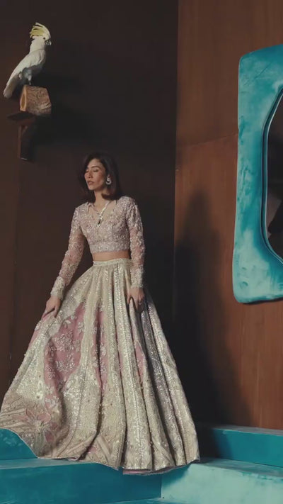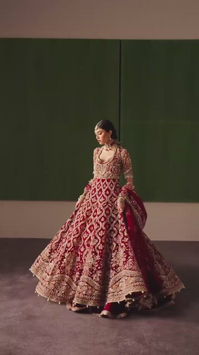 A commanding sharara unveiled in a majestic sapphire hue, elevated through masterful hand-embellishment and refined structure. Intricate motifs in burnished metallic threads and jewel-like accents sweep across the bodice and cascade into the dramatic flare of the sharara, creating rhythm, brilliance, and architectural depth. The expansive silhouette moves with regal fluidity, its richly detailed borders grounding the ensemble in heritage opulence. A coordinating dupatta, ornate yet weightless, drapes with effortless drama, balancing strength with softness. Bold, poised, and unforgettable — this is occasion wear defined by precision, grandeur, and timeless artistry.