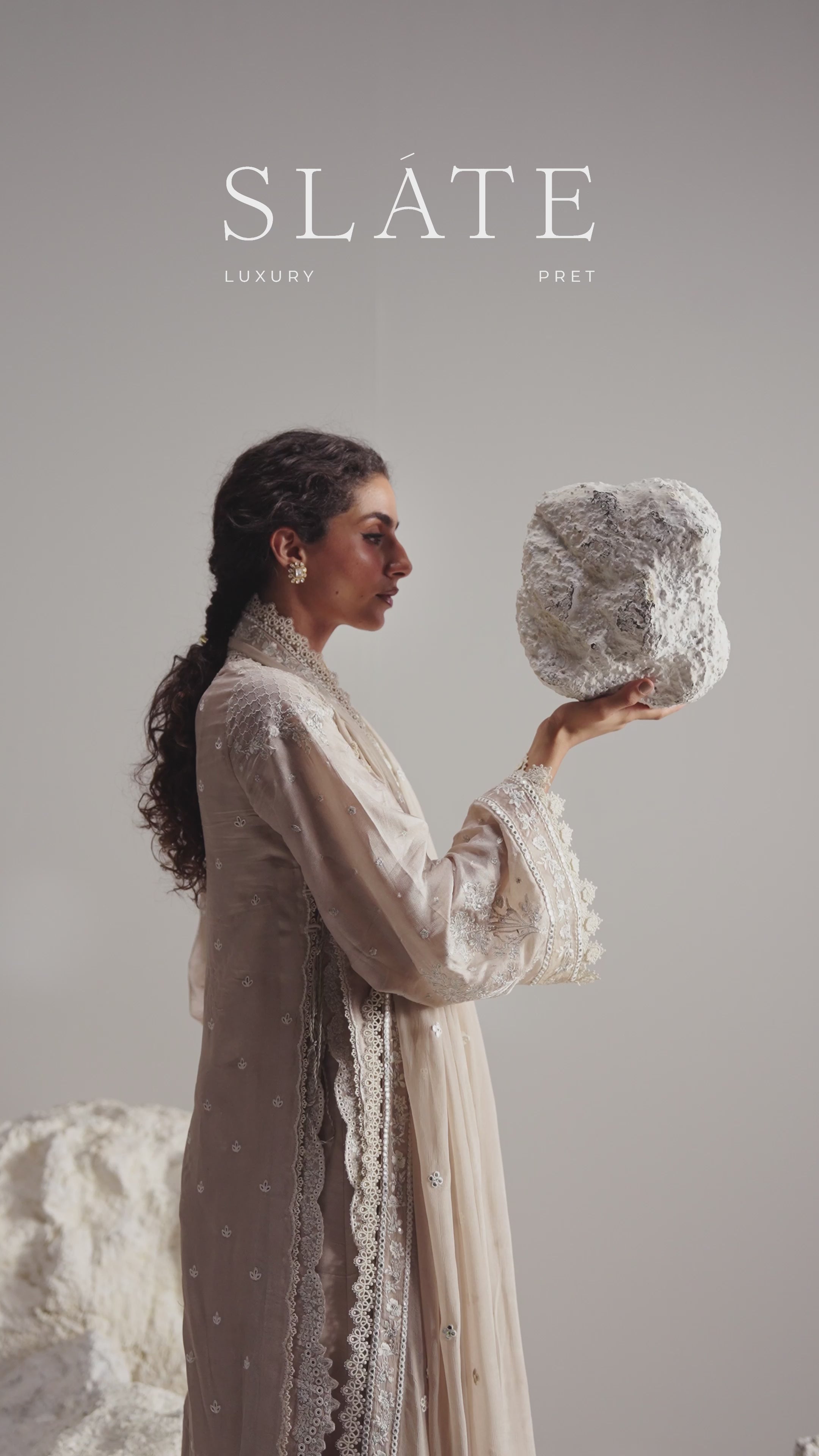 Ethereal beige elegance — this long, fluid silhouette is adorned with intricate tonal threadwork and subtle shimmer that catches the light with quiet grace. Scalloped edges and a lace-trimmed airy dupatta complete the look, creating a refined statement that feels effortlessly modern yet timeless.